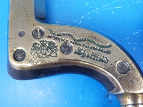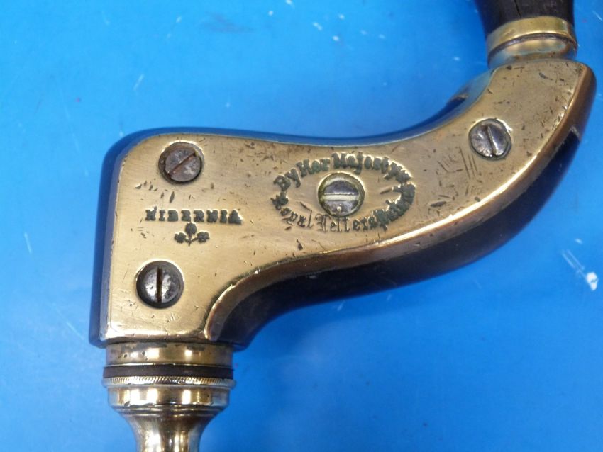 A William Marples Sheffield Victorian Hibernia ebony and brass hand brace 'By Her Majesty's Royal Letters Patent' with Royal coat of arms, together with another brace