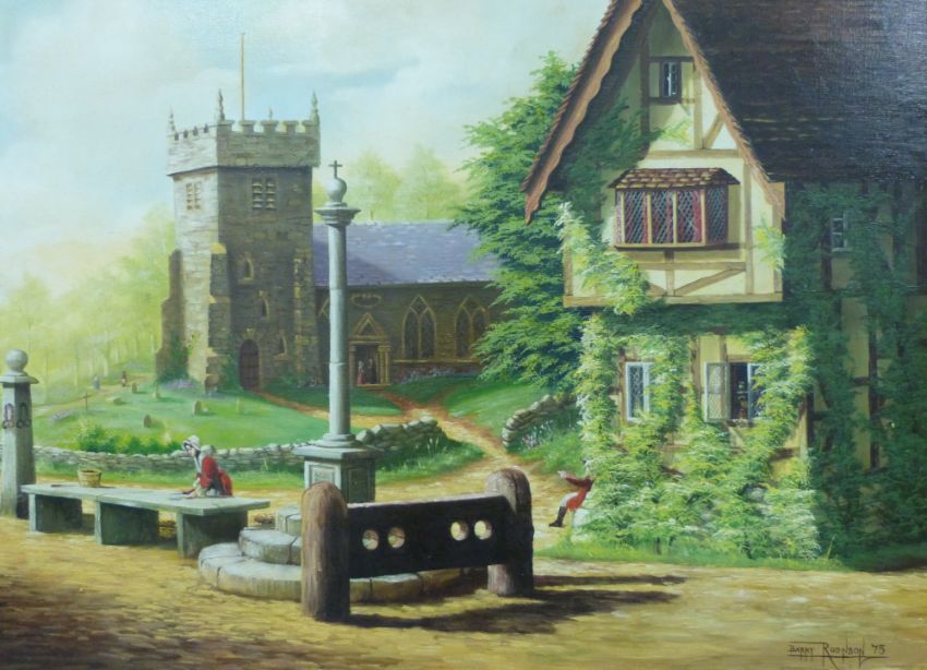 Two Barry Robinson oils on board 'The Cornfield after Constable' (60 x 44cm) and 'The Village Stocks' dated 75 and signed bottom right (45 x 60cm)