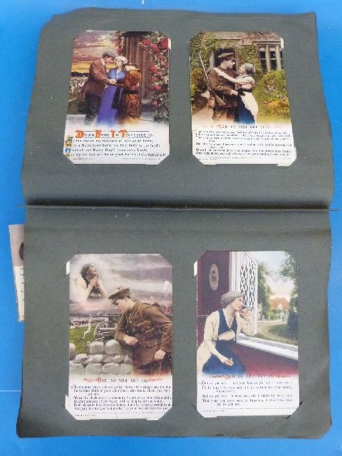 A postcard album dated 1919 containing over 170 WW1 related postcards