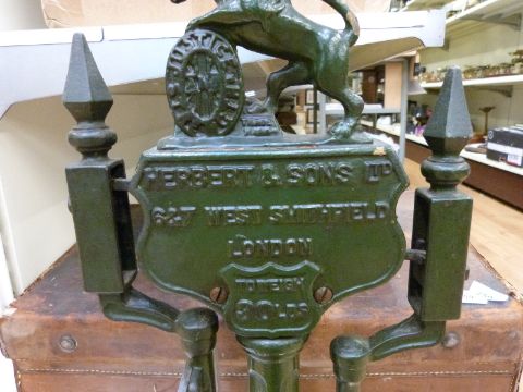 A set of Herbert & Sons, London cast iron 30Ib counter top shop scales with lion to top and ceramic pan together with two Herberts bell weights
