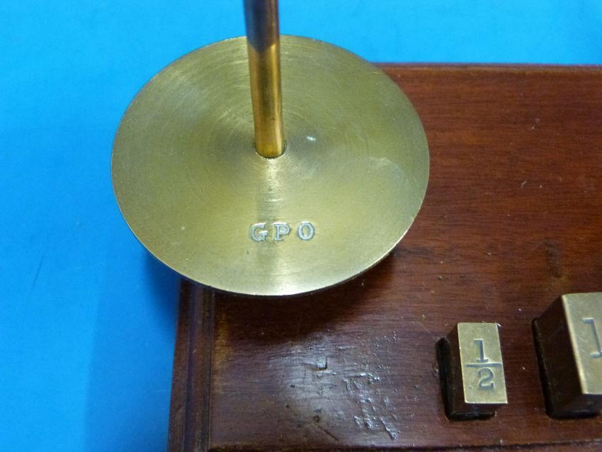 A set of De Grave & Co GP0 postage scales stamped GP0 to both pans, with 0.5, 1, 2 and 4oz weights