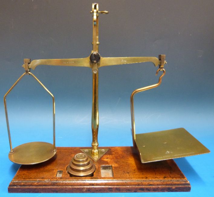 A set of De Grave Short Fanner & Co postage scales, marked to pan GPO with broad arrow, with stack of GPO marked weights by J&J Siddons
