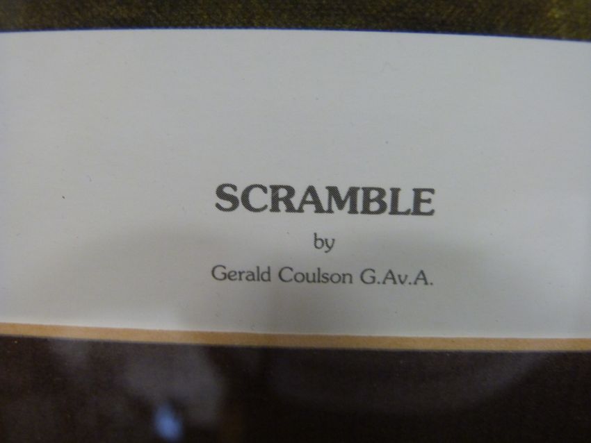 A signed Coulson Spitfire print (56cm x 71cm), Barrie F.A.Clark 'Hurricane' and portrait of a face by Lund