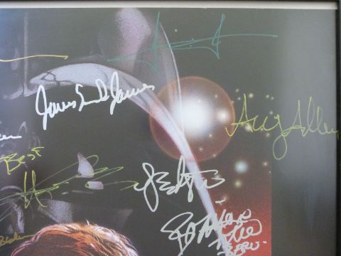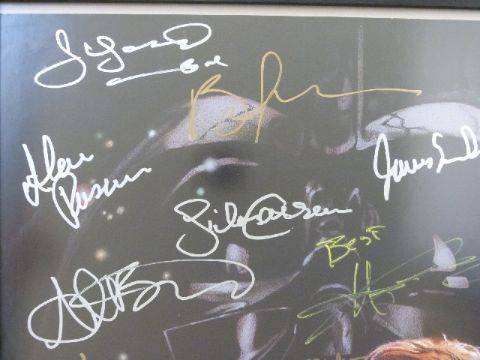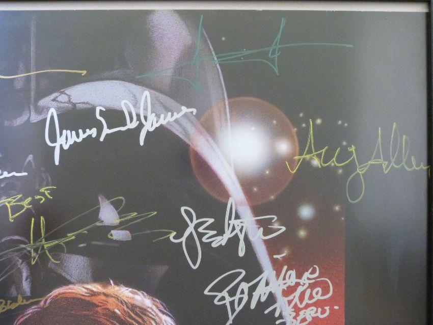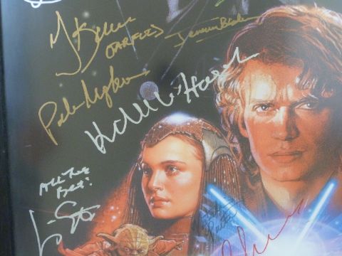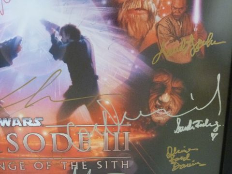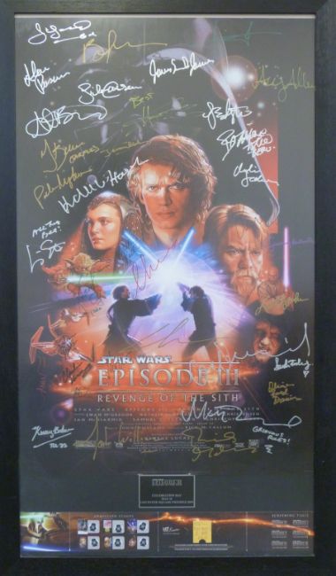 Star Wars 2005 special edition celebration day film poster for Episode III: Revenge Of The Sith from the Leicester Square premier on May 16 2005, hand signed by 32 of the cast including Hayden Christensen, Ewan McGregor, Natalie Portman, Bonnie Piesse, Jimmy Smits, Joel Edgerton, Frank Oz, Ahmed Best, Samuel L Jackson, Peter Mayhew, James Earl Jones, John Williams, Kenny Baker, Anthony Daniels, Ian McDiarmid, Amy Allen, Silas Carson, Rena Owen, Claudia Carvan, Trisha Noble, Oliver Ford Davies, Temura Morrisson, Jeremy Bulloch, Bodie Taylor, Keisha Castle Hughes, Sandy Finlay, Michael Kingma, Jay Lagaaia, Bai Ling, Matt Wood, Rick McCalum and George Lucas. In black wooden frame with original movie ticket for Screen 1, Row G, Seat G7, all admission stamps and certificate of authenticity