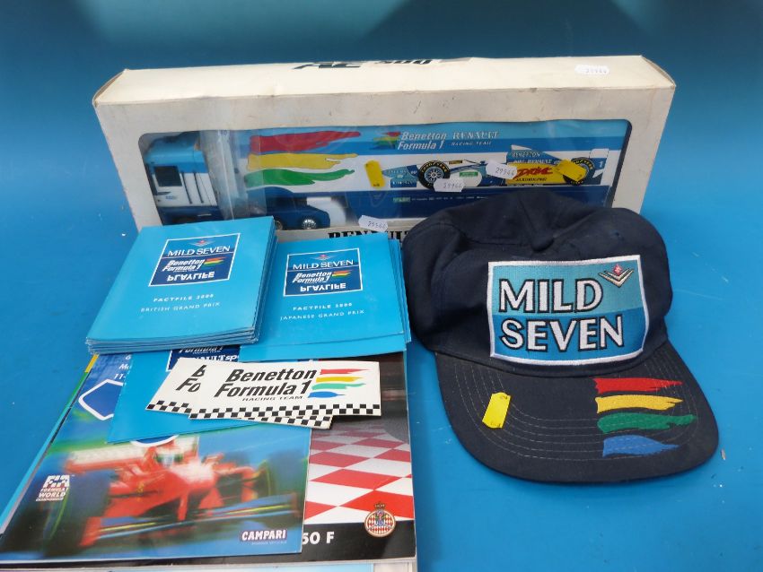 A Benetton racing team lorry, Benetton cap, ephemera including media information pack etc