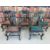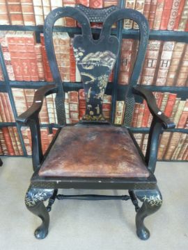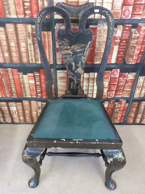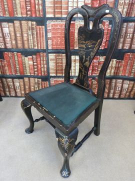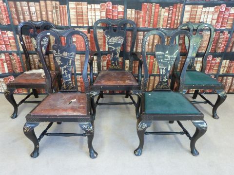 A set of six 19thC William and Mary style ebonised and chinoiserie decorated dining chairs with cabriole front legs, pad feet and drop in seats. Each chair is decorated with a different scene to the heart shaped splats beneath hand carved scrolling pediments