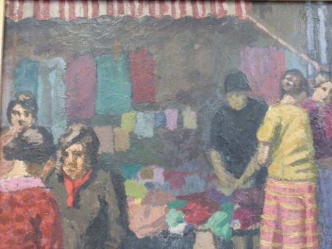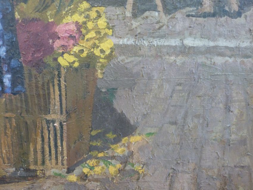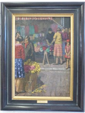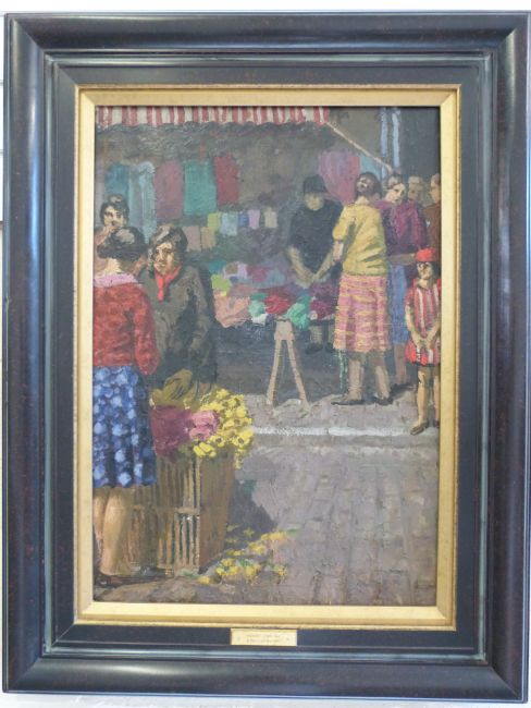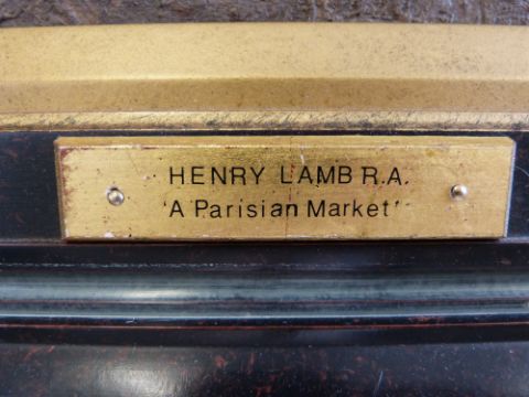 Henry Lamb: RA oil on canvas of a busy French market, flower seller etc. Has a plaque to frame 'Henry Lamb RA, A Parisian Market', unsigned (63 x 44cm)