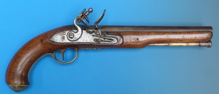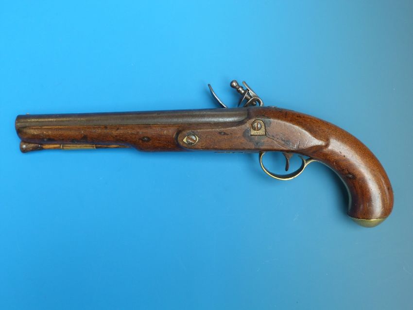 A Flintlock holster pistol with proof marks to the barrel and brass mounts, the trigger guard with engraved floral bouquet and acorn finial circa 1820.