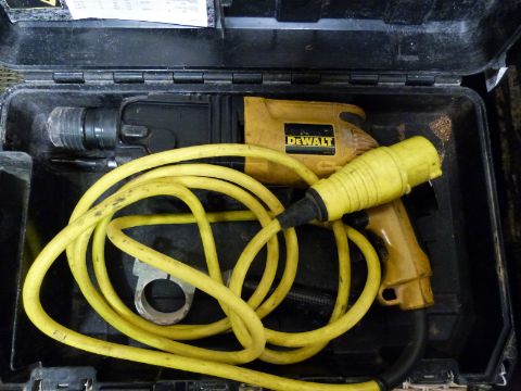 A cased Dewalt Div 586LSDS power drill together with a 110 volt transformer and a quantity of cable etc