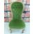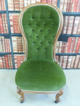 A balloon back chair with green button-back upholstery, raised on carved bow legs with original castors