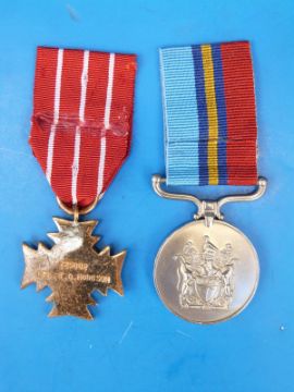 A Rhodesian General Service Medal and bronze cross awarded to 725082 CPL T. Hodgson. Part of Corporal Hodgson's citation is mentioned in an accompanying newspaper clipping: September 1977, his troop came under fire by terrorists near an old ruin in thick bush. His troop killed most of the terrorists. Sergeant Hodgson personally killed seven or eight (mentioned in Contact page 175)