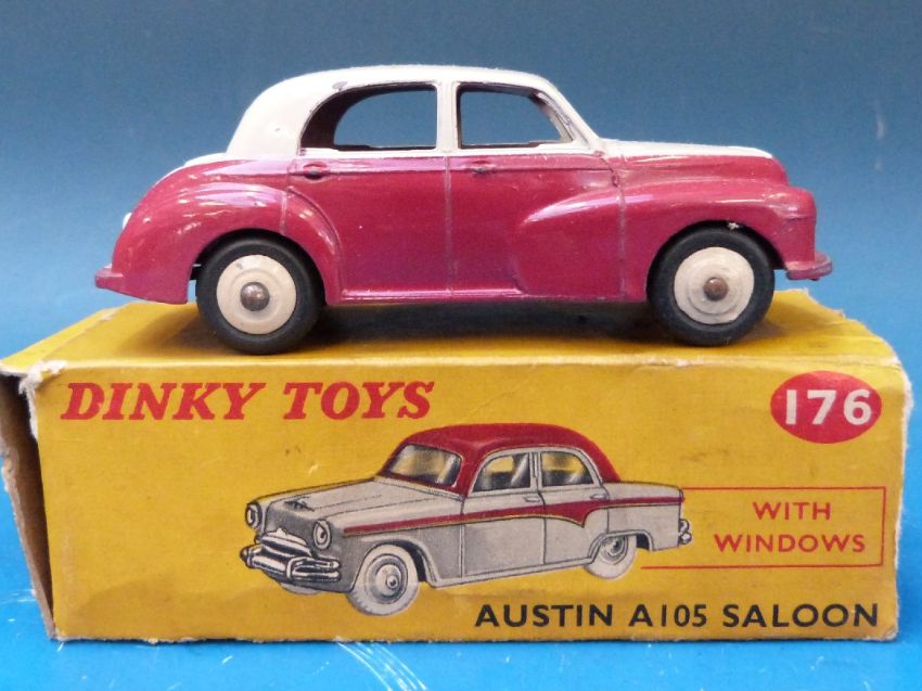 Three Dinky Toys diecast model cars, Austin A105 saloon 176, Triumph Herald 189 and Austin taxi 254, all in original boxes