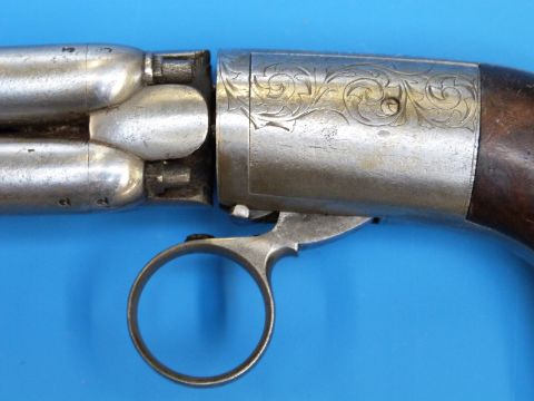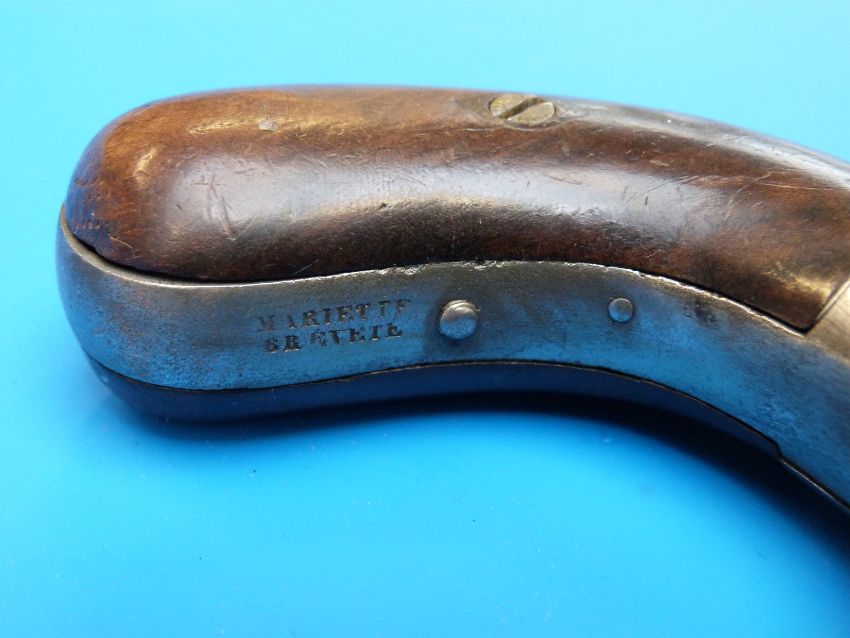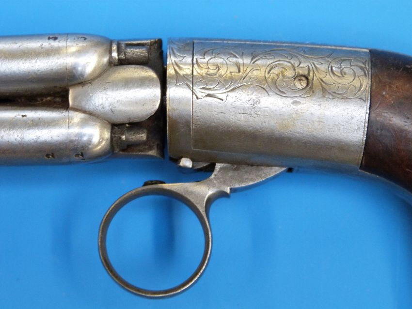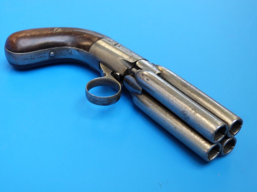 A Mariette four barrelled percussion pepperbox revolver with ornate scrolling engraving circa 1840