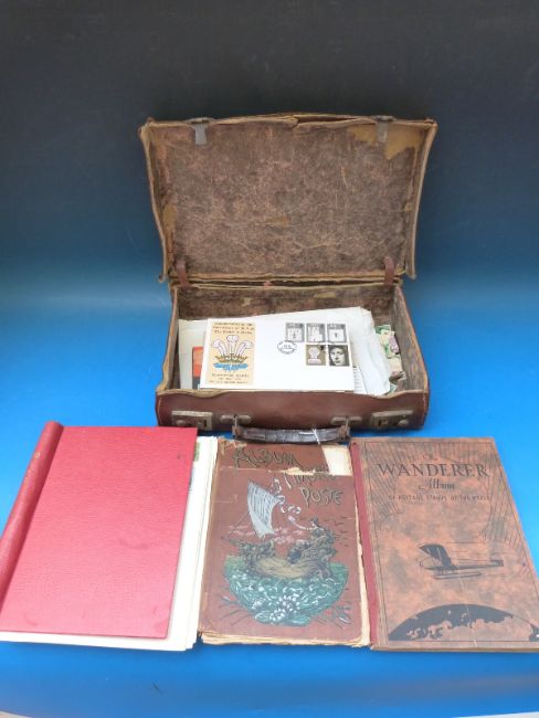 A suitcase containing various stamp albums, covers etc, and three cigarette card albums