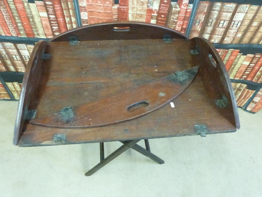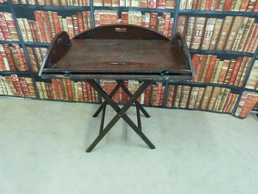 A 19thC mahogany butler's tray with folding sides, on folding stands together with three various chairs