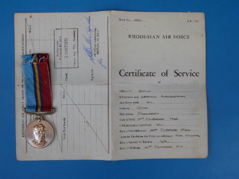 A Rhodesian General Service Medal awarded to 50142 SACII Olliverty together with his Rhodesian Air Force certificate of service