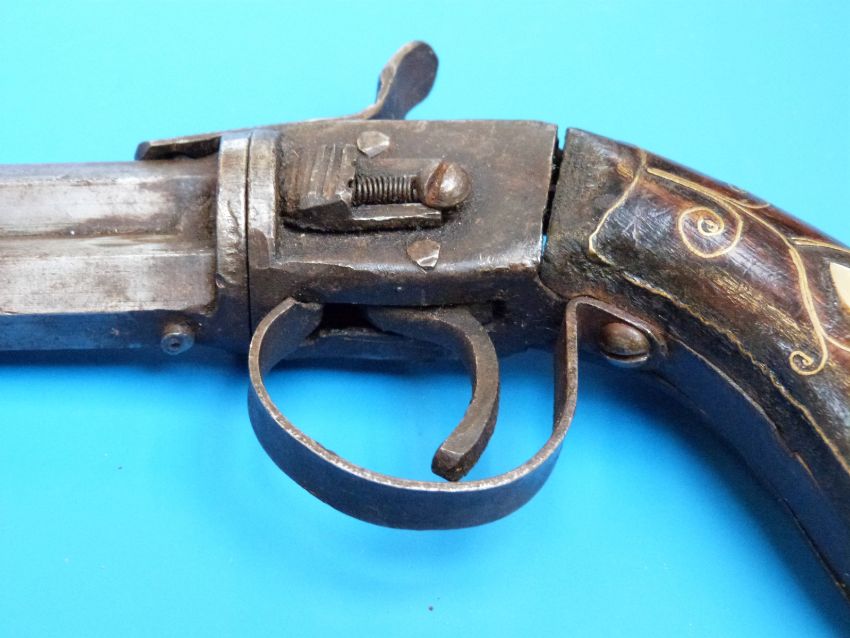 A Turkish over and under percussion pistol with mother of pearl and brass wirework inlay to the grips, circa 1840.