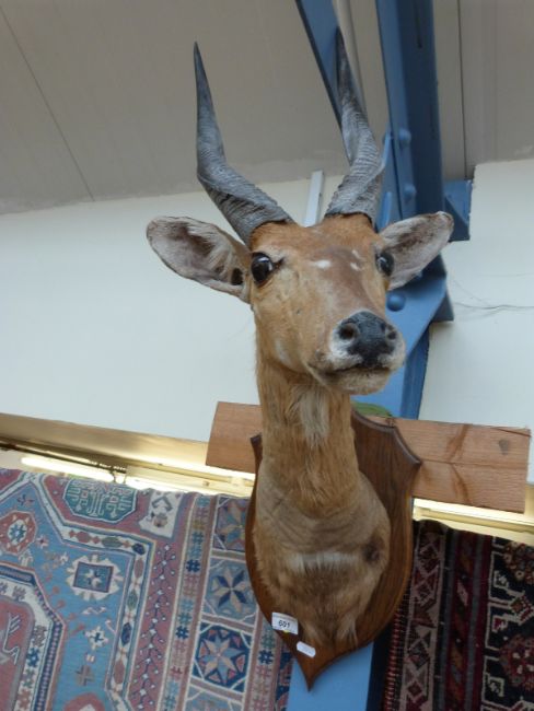 A taxidermy shoulder mount of a bush buck together with a skull mount of a bush buck