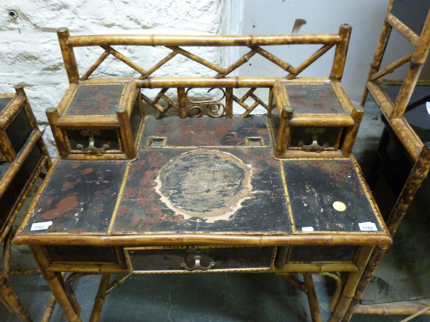 An oriental bamboo and lacquer side table or desk with two small drawers to top and single drawer below (W86 x D55 x L111cm)