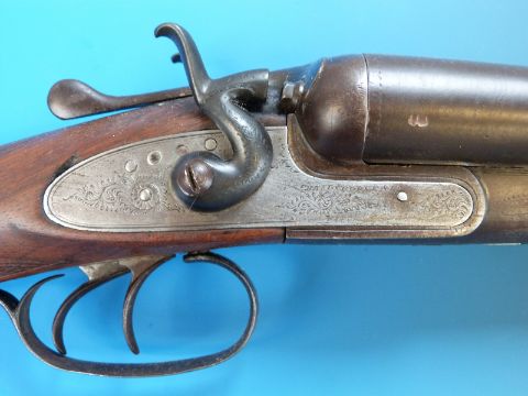 A Charles Osborne 12 bore double barrelled side by side hammer action shotgun, the side plates with floral engraving and named Chas Osborne & Co. The stock and forend with chequered grip and the Damascus barrels named Chas Osborne & Co, 2 Prince Place, London, serial number 26692 With deactivation certificate.