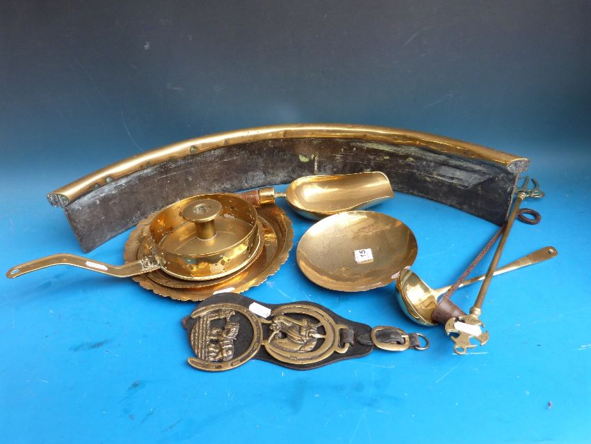 A 19thC brass fire fender, chamber stick, horse brasses etc