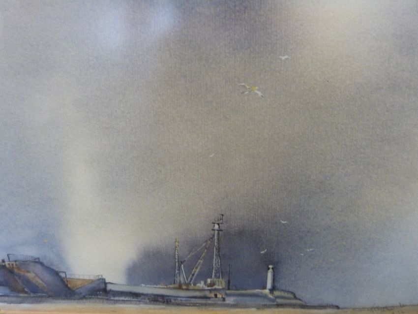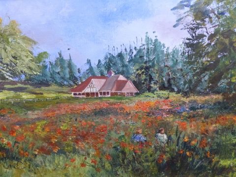 Janet Outhwaite: Oil on canvas of a home in landscape together with two watercolours by the same artist and one other