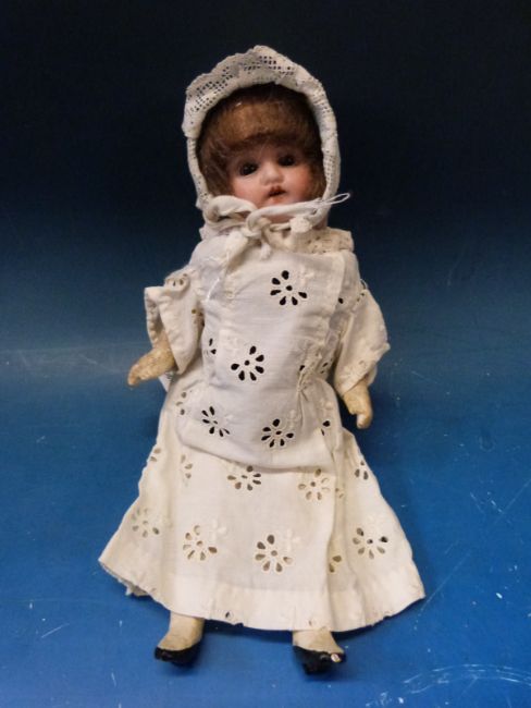 A Victorian doll, approximately 20cm in length, with open mouth, teeth, closing eyes and real hair
