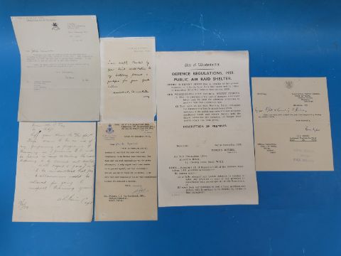 A quantity of WW2 and later military ephemera including City of Westminster air raid poster dated 4th September 1939 relating to W Hill & Son, General Building, Aldwych, Churchill birthday thanks letter, three 1950s letters of thanks to RAF officers regarding visits and another military interest letter from OC C Coy signed by R Bain and dated 17/6/22