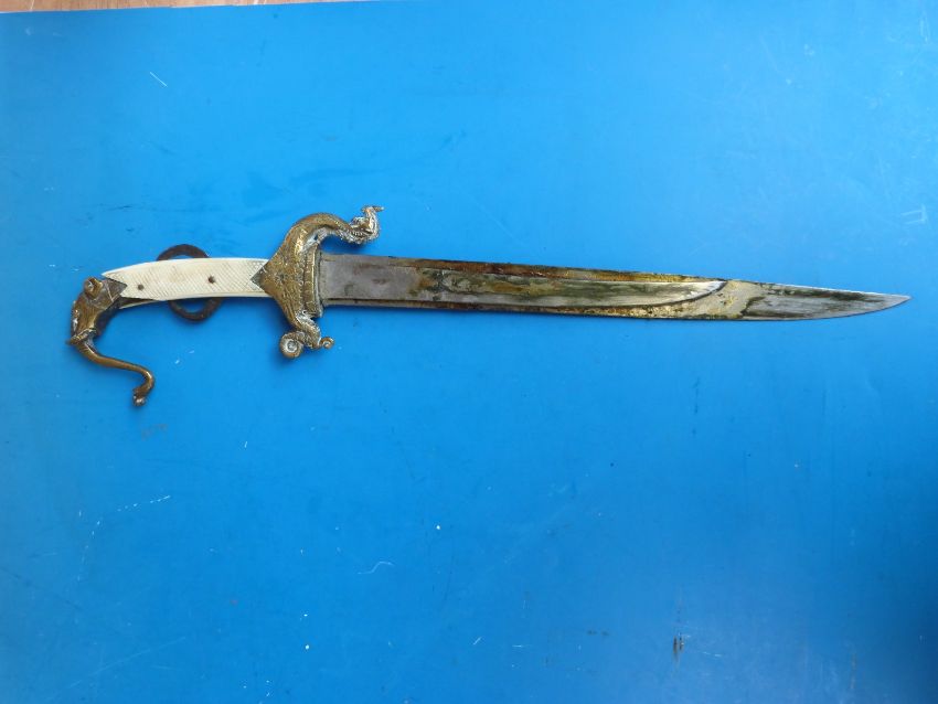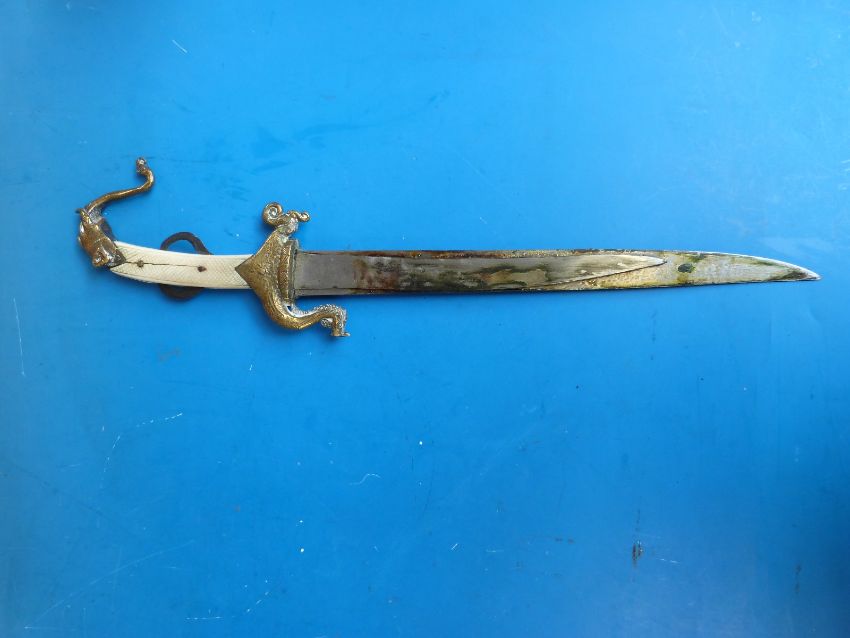 An 18thC/19thC Indian triple-bladed dagger with ornate handle and brass sheath,