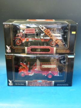 Two Road Signature series 1:24 scale diecast model fire engines, 1925 Ahrens-Fox N - S - 4, and 1938 fire truck (both with 24ct gold plated coins and in original boxes)