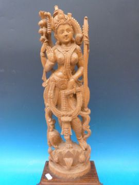 A Indonesian carved wooden figurine of a goddess on a rosewood base