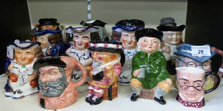 A collection of Toby jugs including Doulton Beefeater and Falstaff, Wedgwood and three Allerton graduated jugs etc