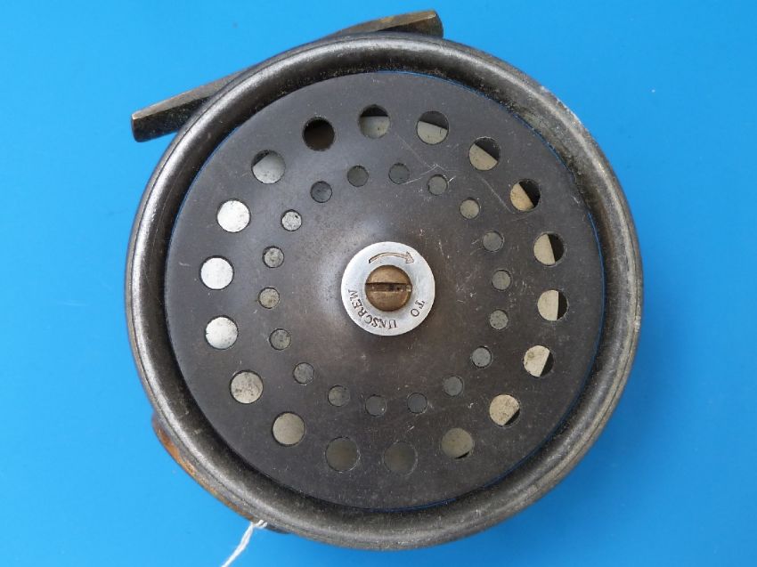 A fishing reel with brass foot by J S Sharpe, Aberdeen