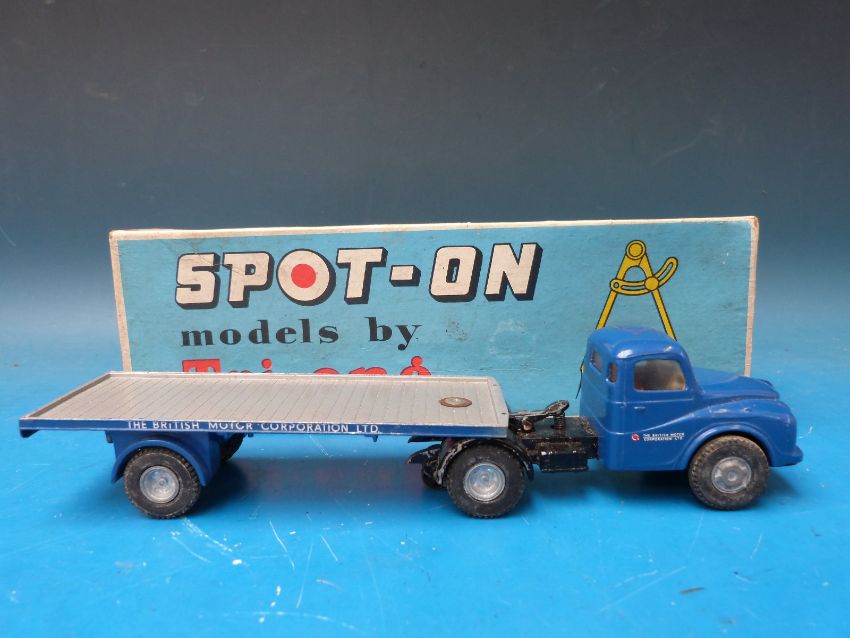 Spot-On by Tri-ang diecast model 1:42 scale Austin Prime Mover with articulated flat float in B.M.C. dark blue livery, 106A/00, in original box.