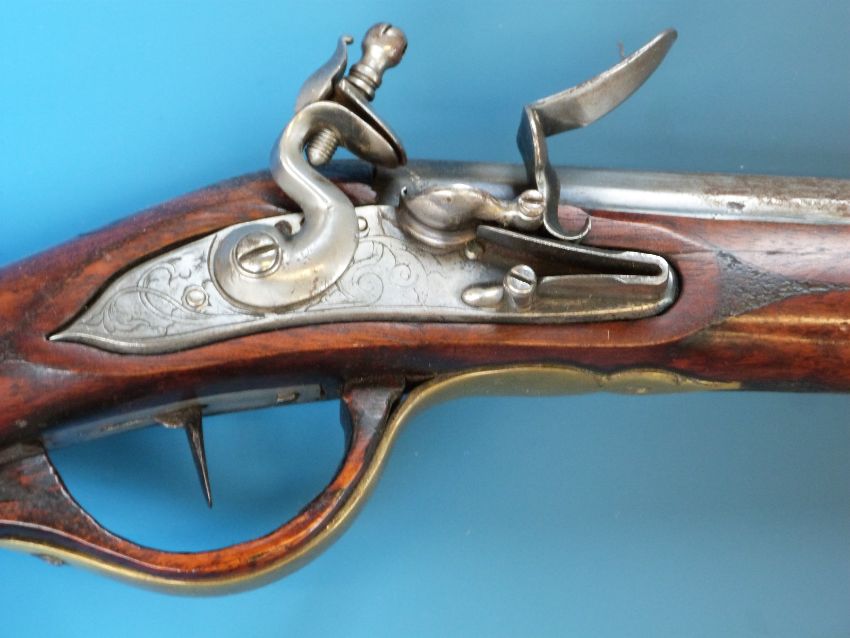 A Continental 20 bore flintlock rifle with ornately carved stock and trigger guard, brass mounts, horn tip and engraved lock plate. The stock with built in shot compartment, horn tipped cover and embossed brass butt plate, circa 1820.