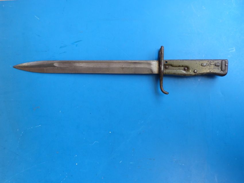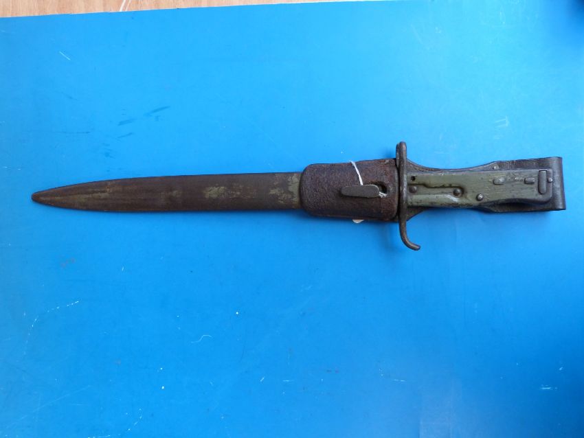 A German Ersatz bayonet and scabbard with original leather frog, crowned 3 to edge of 31cm blade