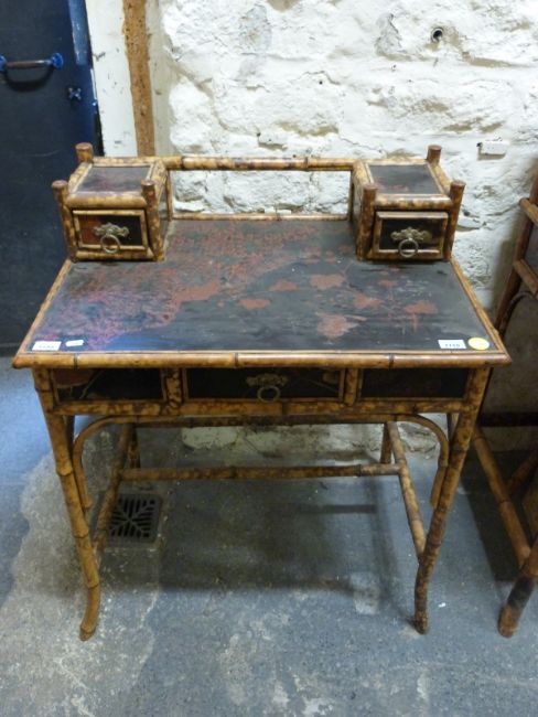An oriental bamboo and lacquer side table or desk with two small drawers to top and single drawer below (W74 x D50 x H92cm)