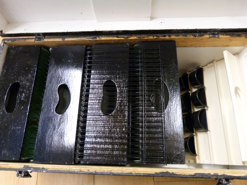 Two travelling boxes for travelling with birds, ex Gloucester Canary Show cages, each box containing four cases, drinkers etc