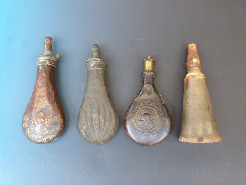 Two copper powder/ shot flasks, one by James Dixon & Sons embossed with shooting scene, together with a leather and horn example