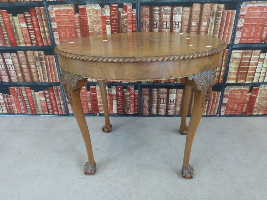 An oval walnut table raised on cabriole legs with ball and claw feet, max diameter 92cm