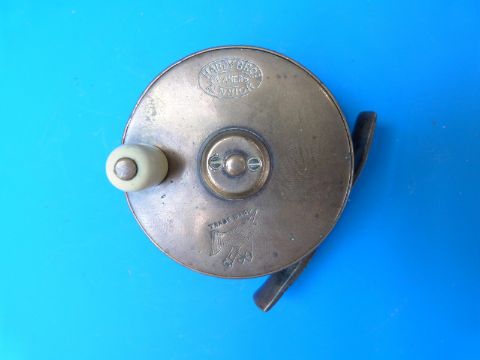 A rare engraved and dated Hardy Brothers of Alnwick brass faced fishing reel, 2.5" diameter, early trademark to face and W Cunliffe 1894 verso