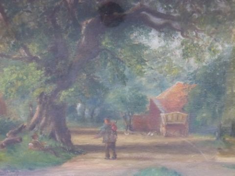 L.H Coller: Oil on canvas of a vagrant on a lane beneath an oak tree (30cm x 46cm)