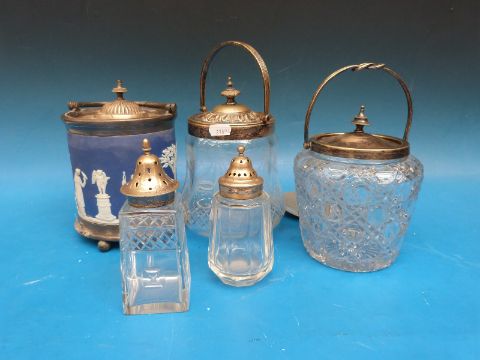 Wedgwood and glass biscuit barrels with plated mounts and two sifters