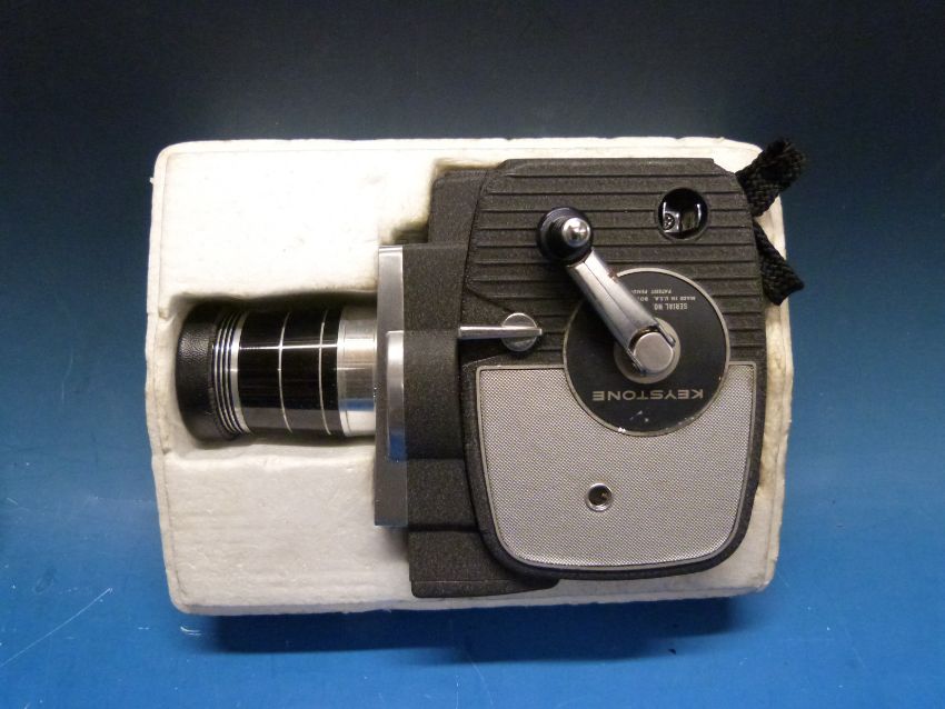 A collection of vintage cameras and equipment including a Keystone cine camera, Halina, Panasonic, Kodak etc