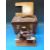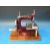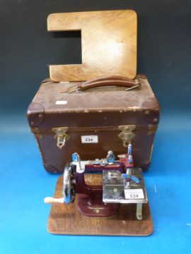 A cased toy sewing machine mounted on metal frame