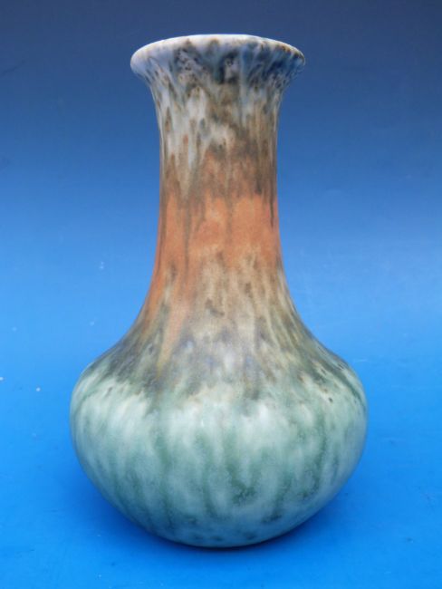 A Ruskin bottle form vase with mottled green decoration, marked Ruskin England and dated 1933 to underside, height 15.5cm