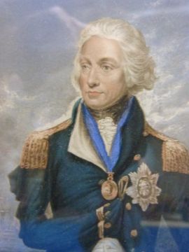 A framed Baxter print of Admiral Lord Nelson in naval dress with ships to background (10.5 x 7.5cm)