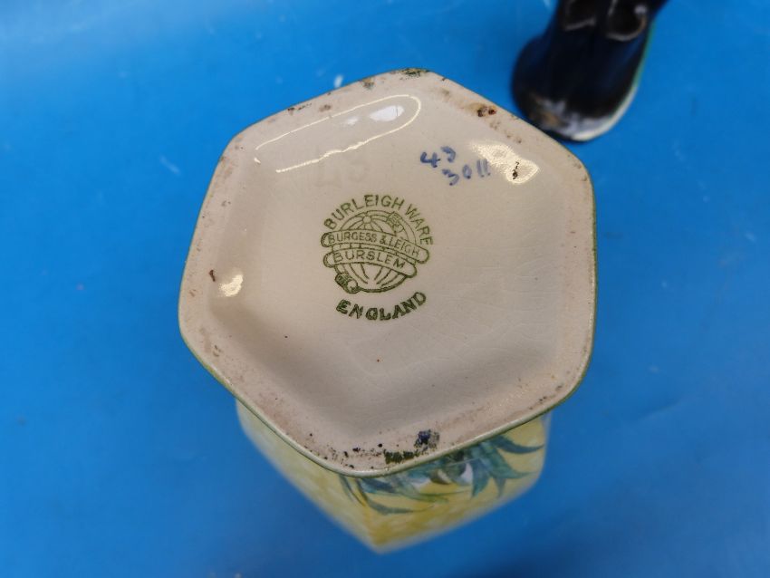 A Wilkinson pottery vase with bird finial, and a Burleigh ware Art Deco vase decorated with ducks in flight