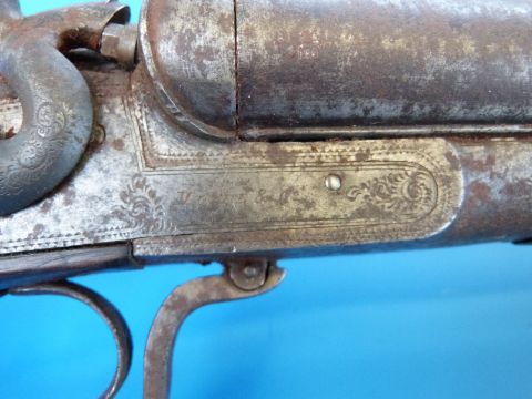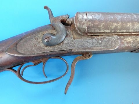 A deactivated Moore & Co side by side double barrelled shotgun with 30" Damascus barrels hammer action, engraved locks, chequered grip and horn tipped parend