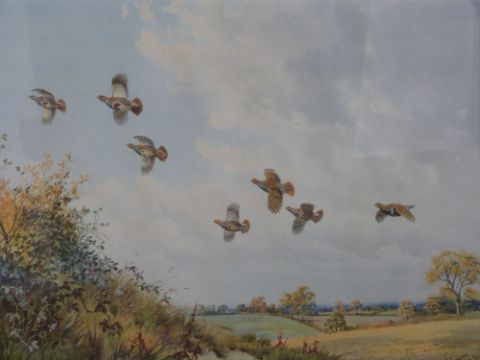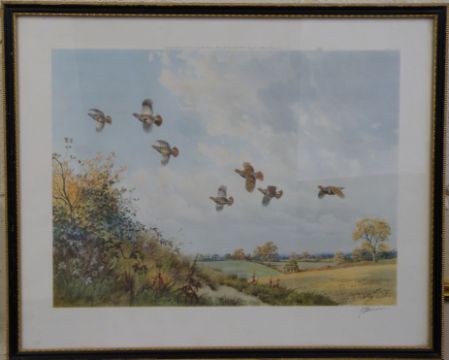 J. G. Harrison framed and glazed print of partridge in flight (50cm x 39cm)